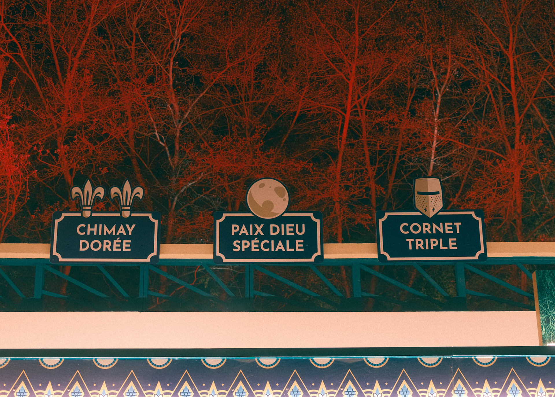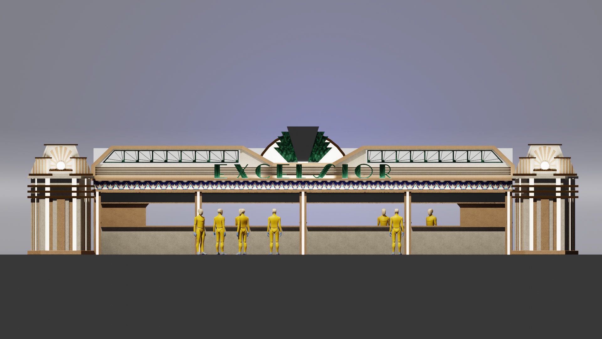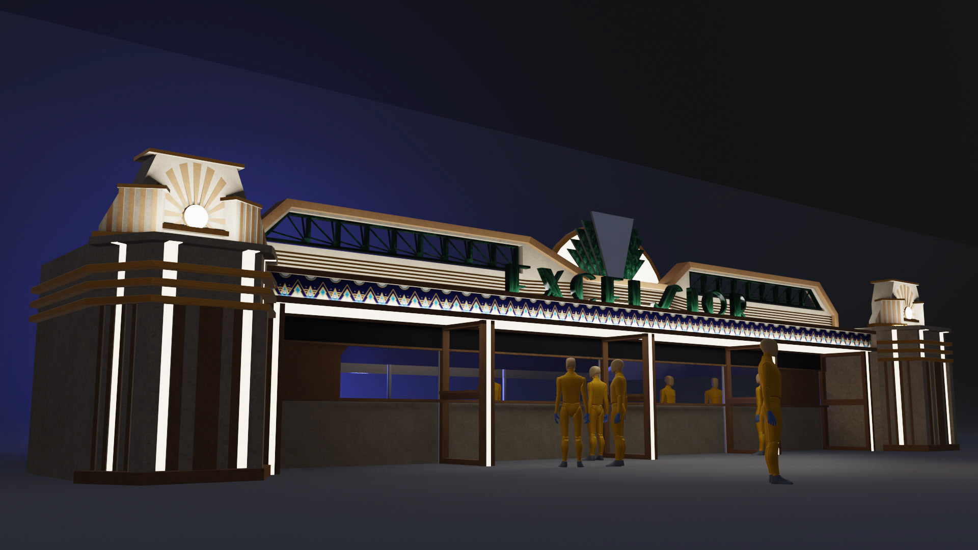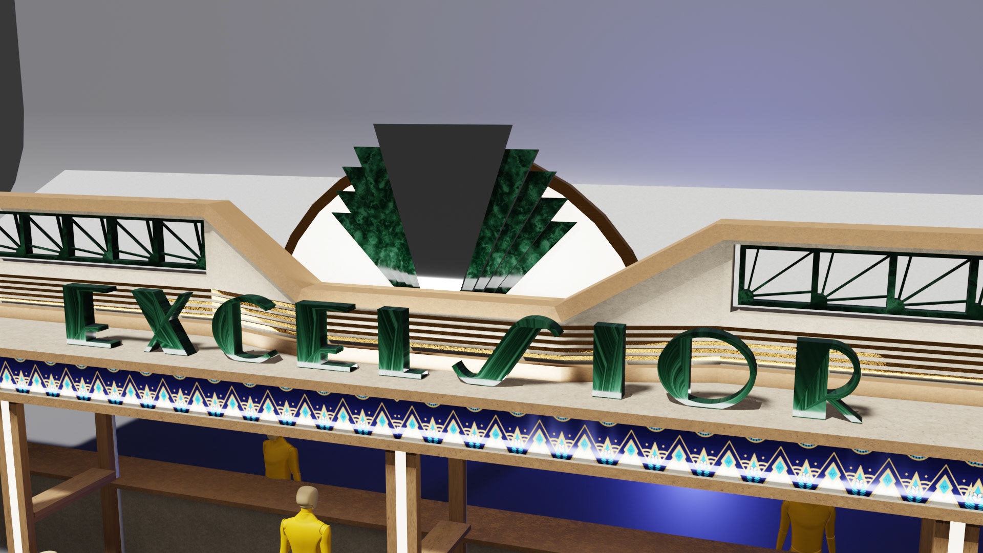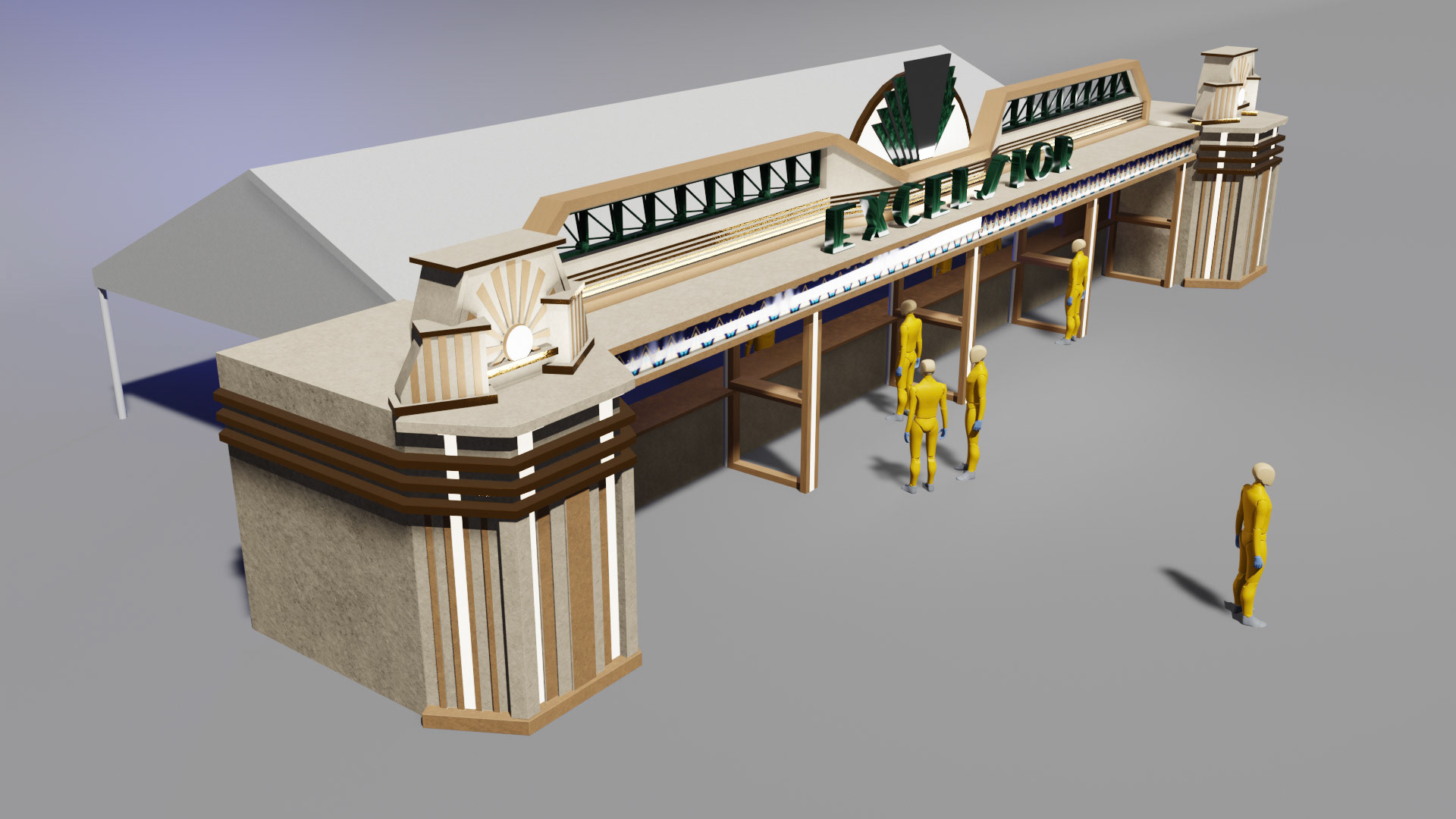 The structure was modeled and rendered in Blender, allowing the team to refine proportions, lighting, and the general atmosphere before construction. A decorative frieze was designed separately, digitally illustrated with Art-Deco patterns, then prepared for large-scale printing and application on site. Typographic research and material studies were carried out to ensure coherence with the architectural theme.