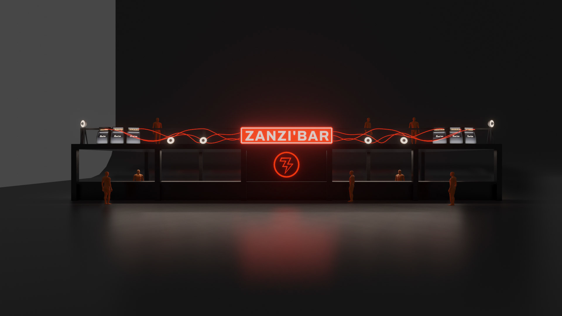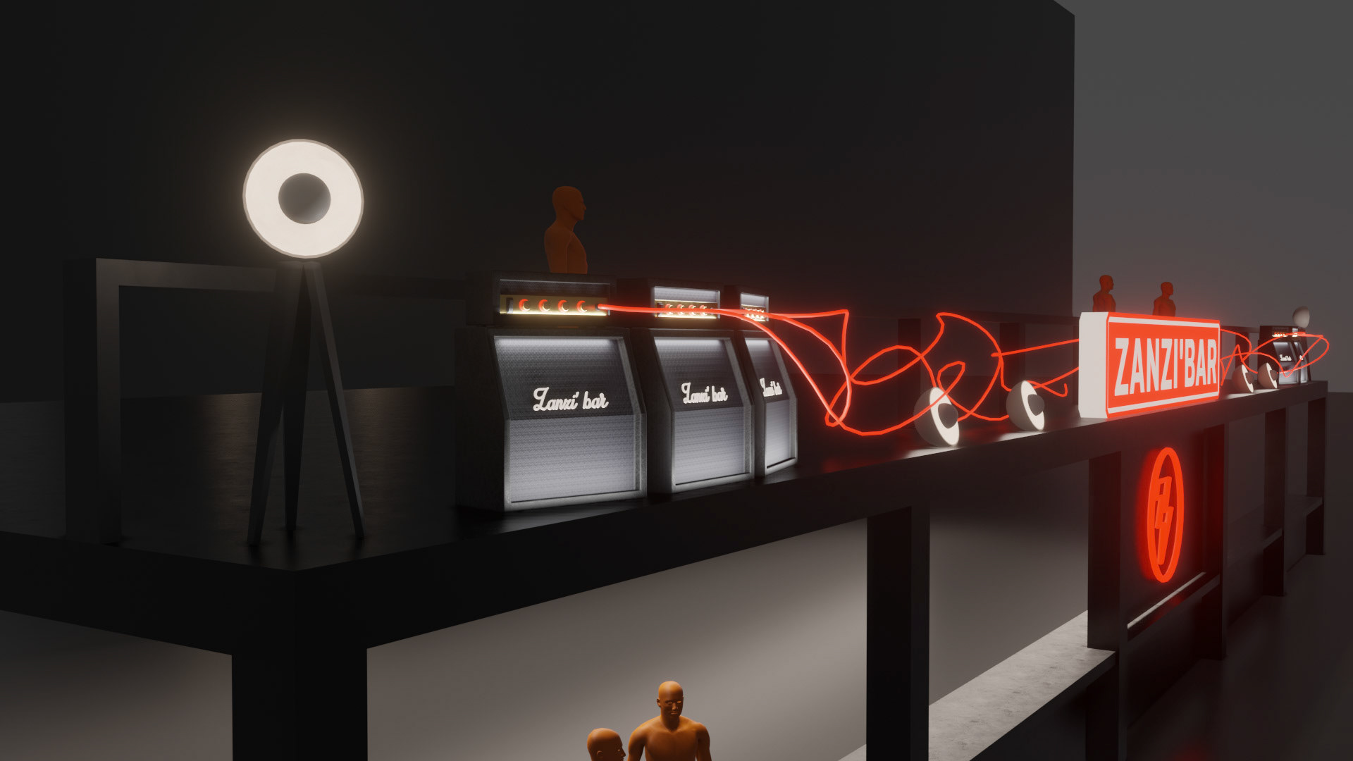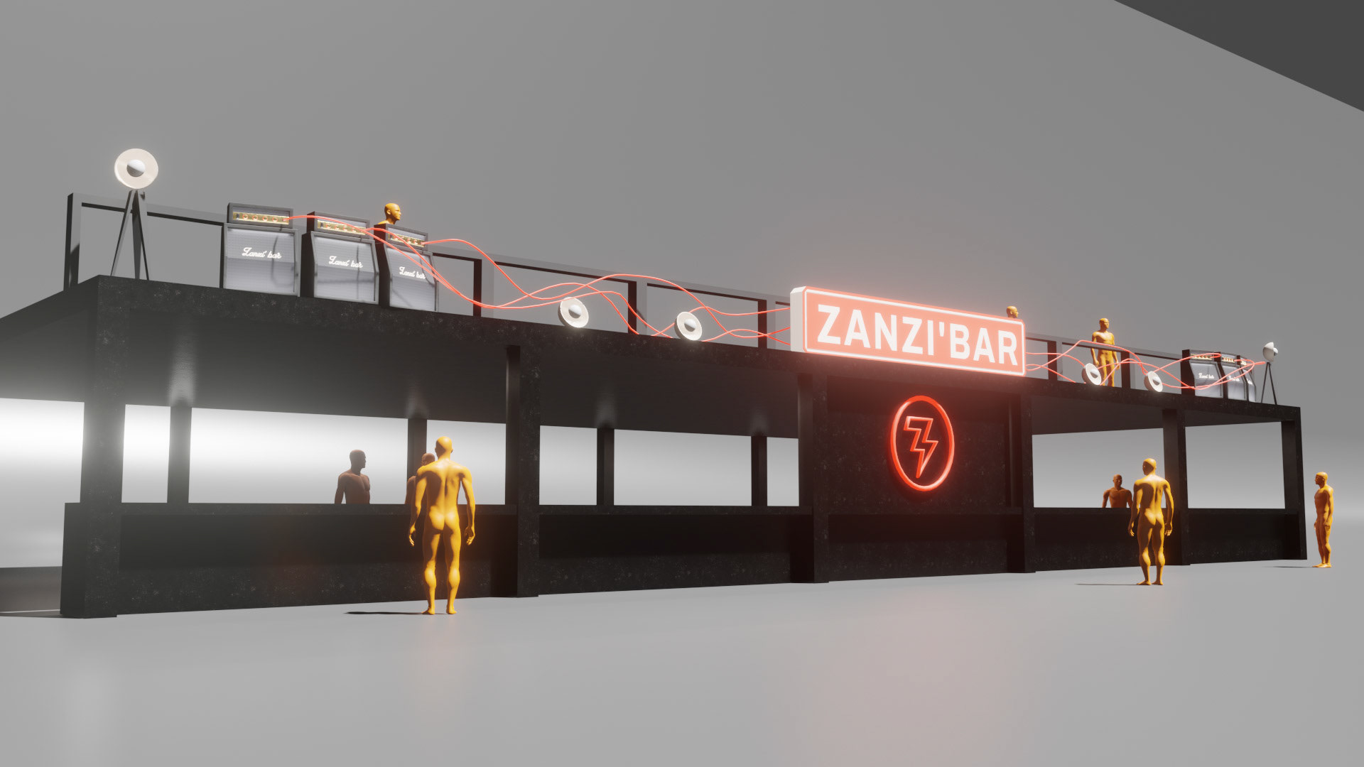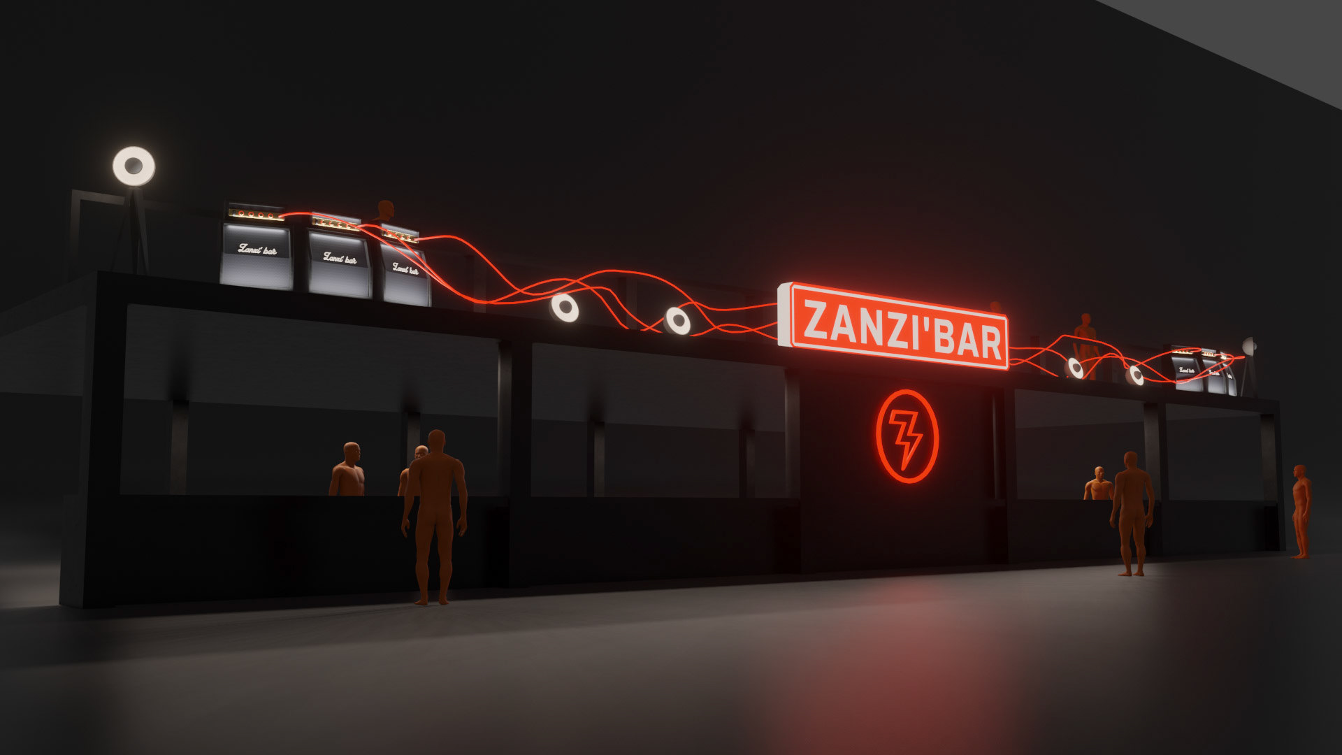 A rock-and-backstage aesthetic guided the visual identity: fake Marshall-style amplifiers were custom-built, linked by luminous jack cables running across the structure, leading the eye toward the main illuminated “Zanzi Bar” sign.