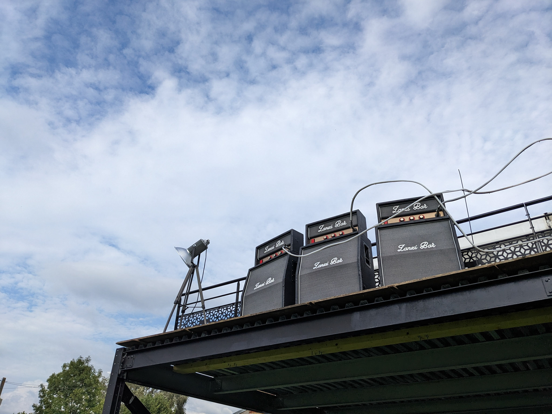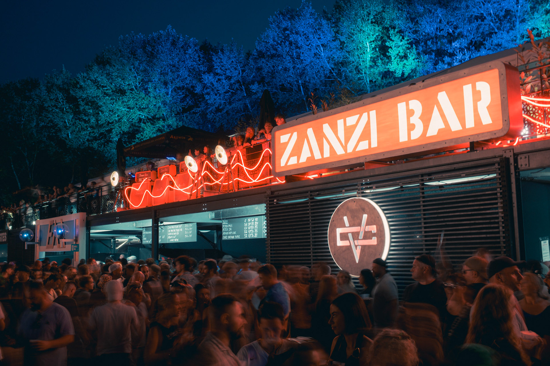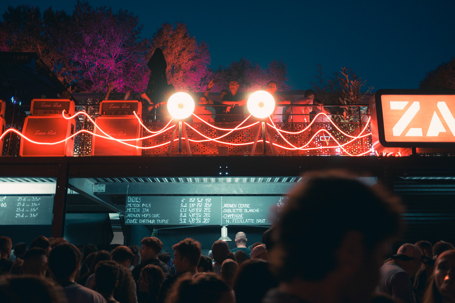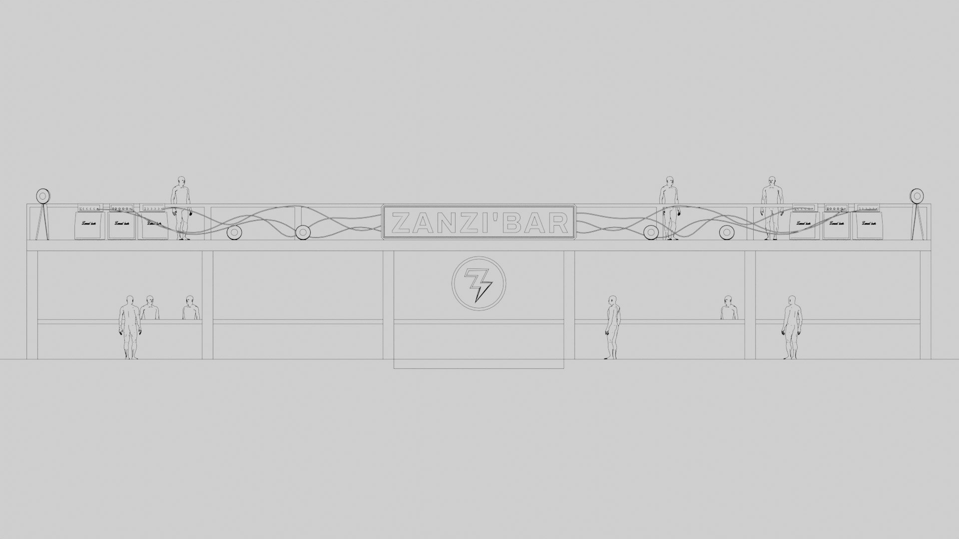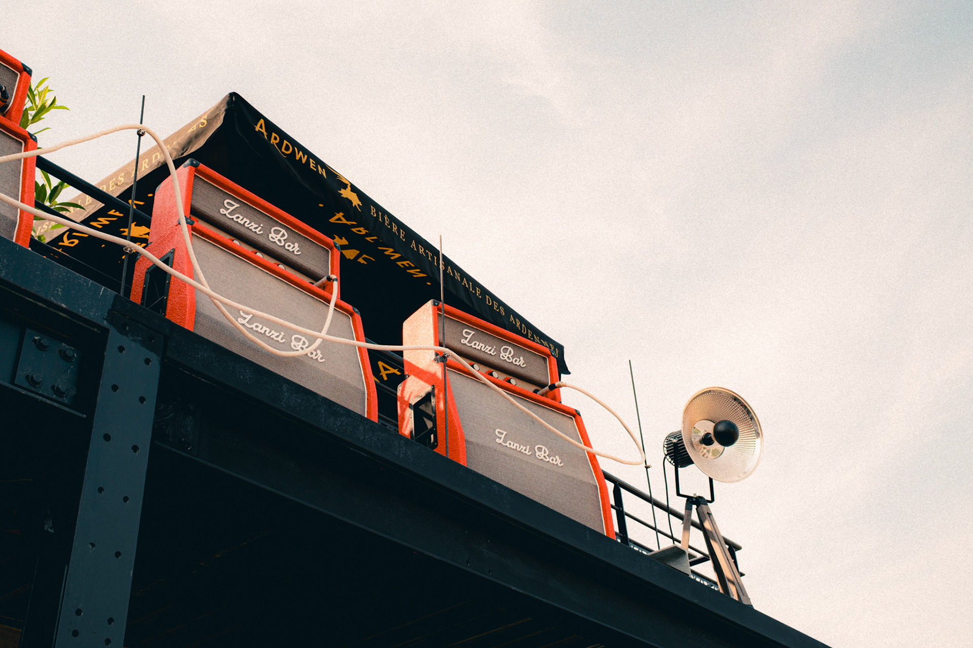 A rock-and-backstage aesthetic guided the visual identity: fake Marshall-style amplifiers were custom-built, linked by luminous jack cables running across the structure, leading the eye toward the main illuminated “Zanzi Bar” sign.
