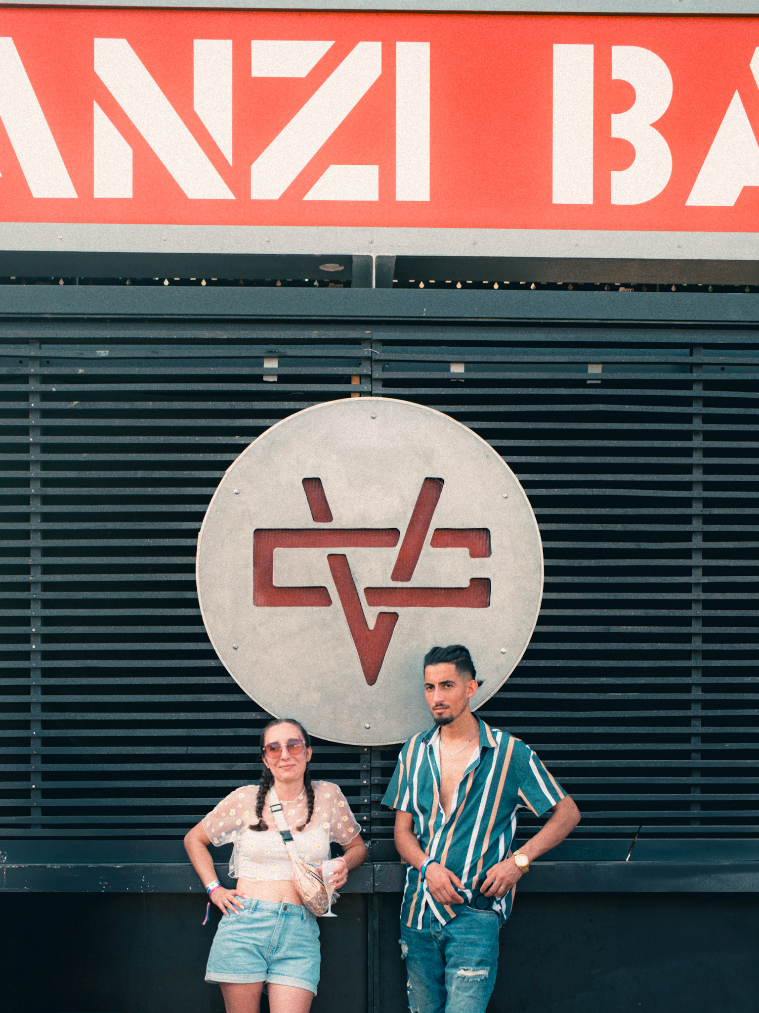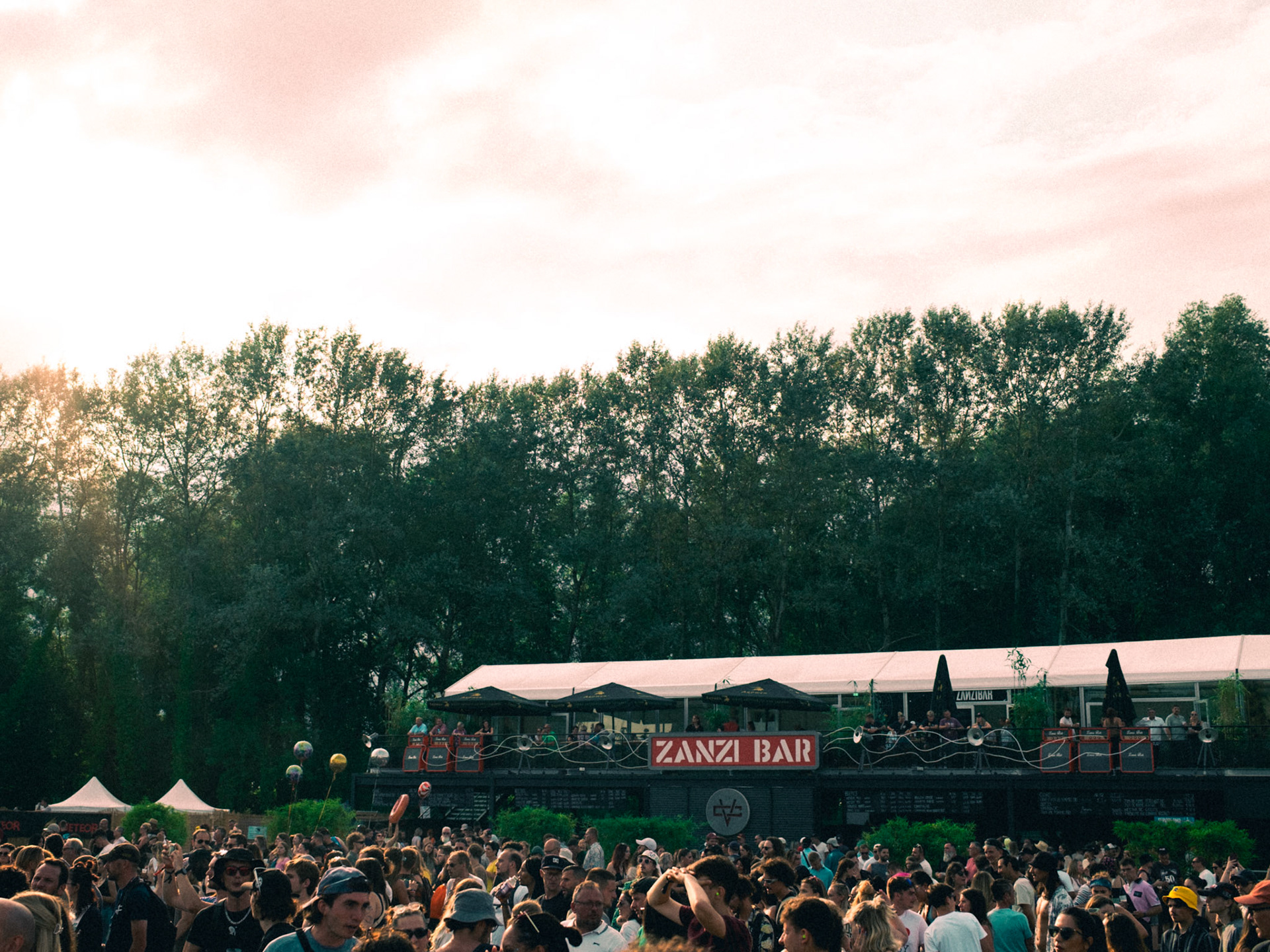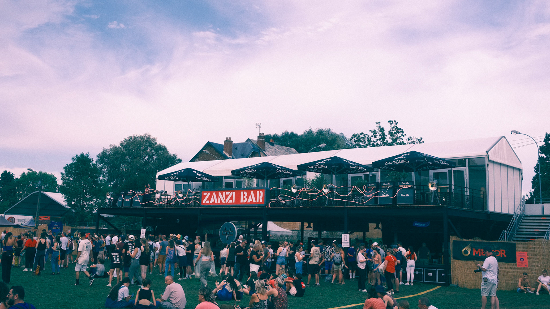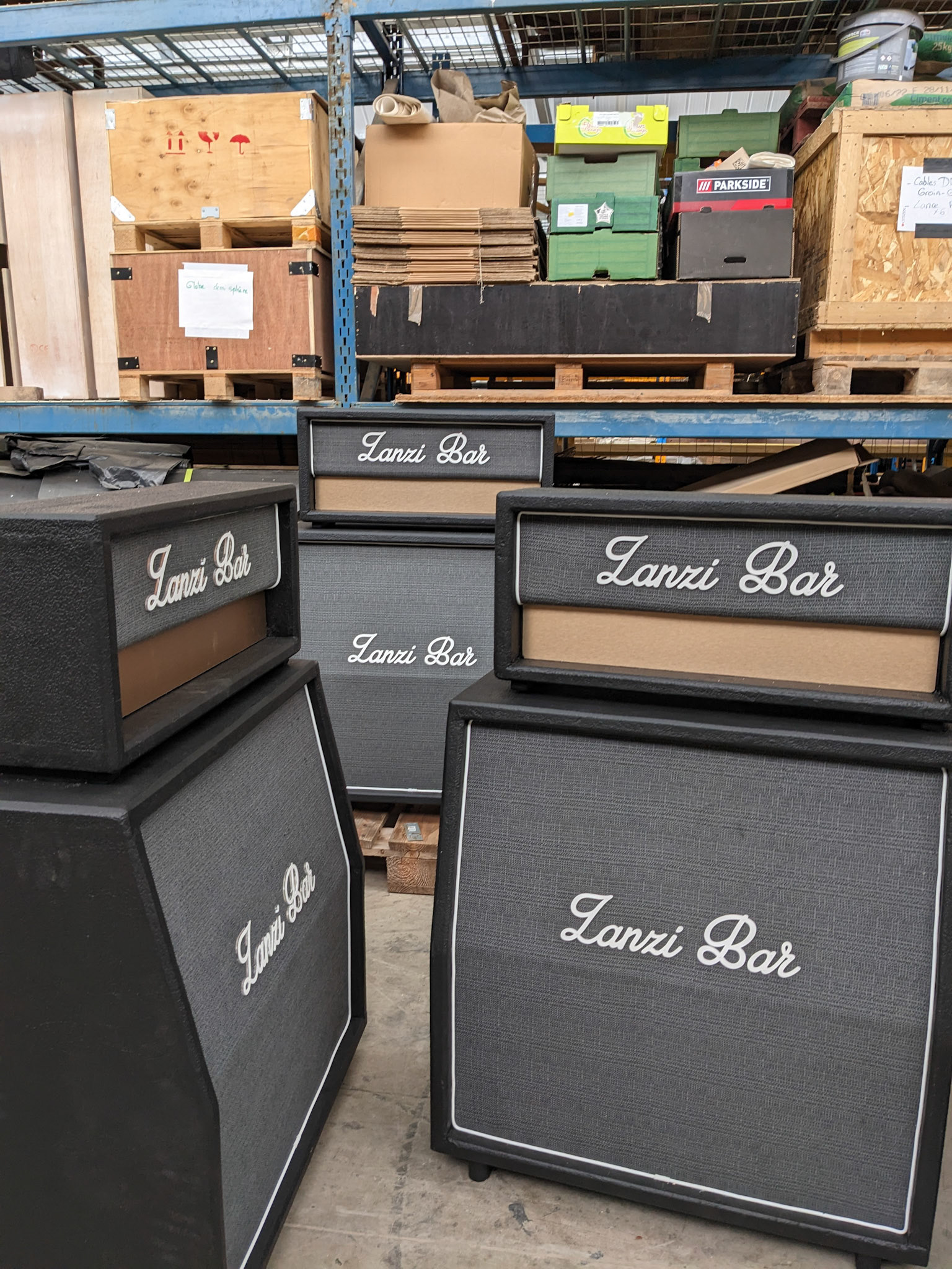 A rock-and-backstage aesthetic guided the visual identity: fake Marshall-style amplifiers were custom-built, linked by luminous jack cables running across the structure, leading the eye toward the main illuminated “Zanzi Bar” sign.